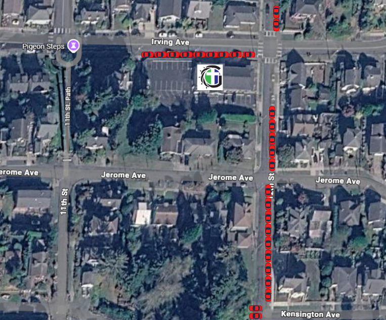 Our Church has parking in the lot for small and mid-sized vehicles, as well as parking on Irving Street. Additionally, on-street parking within one to two blocks of the church building is available, as indicated in red on 12th Street. Please be sure to obey all parking signs and do not block driveways.
